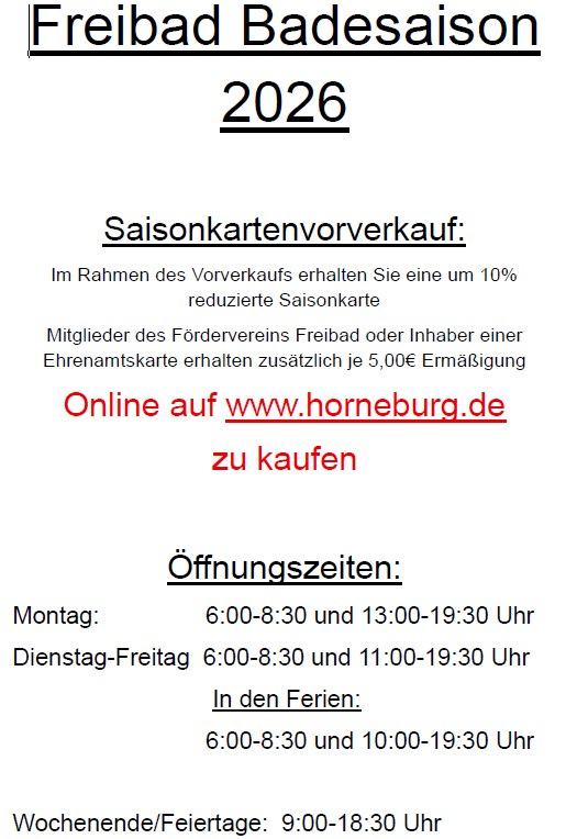 Die Schwimmsaison 2026 startet am 16.05. und endet am 19.09.2026 ![]() Am 21.02. 2026 war unser Winterbaden mit Sauna und Punsch Trotz 15 cm Eis und bedecktem Himmel ein schöner Nachmittag! ![]() Die aktuellen Öffnungszeiten, Preise und Informationen zum Vorverkauf finden sie auf der Internet-Seite der Samtgemeinde: Samtgemeinde Horneburg - Freibad -------------------------------------------------------------------------------- Am Donnerstag, den 5. Februar 2026: war die Jahreshauptversammlung des Fördervereins Hier bitte das Protokoll aufrufen! Hier ein Hinweis: Unser Freibad wurde am 28. 07. 1957 eingeweiht. Nächstes Jahr ist es 70 Jahre her! Hier die Haus- und Badeordnung Stand: 04.03.2019 Klicken sie hier auf das Dokument Unsere Bankverbindung: Kreissparkasse Stade DE 61 24151116 0000 944884 |
